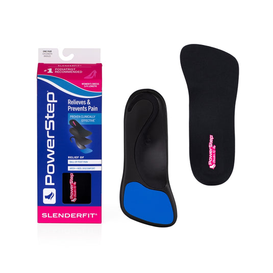 PowerStep® SlenderFit Women's Insole- The PowerStep® SlenderFit® SlenderFit Fashion 3/4 insoles with built-in arch support and plush cushioning foam layer have an ultra slim design for lower profile women's fashion shoes. The 3/4 length with tapered edge leaves extra room at the toes while the built-in metatarsal padding alleviates pressure under the ball of foot for greater comfort and protection. The natural grip of the foam underneath that helps hold the insole in place. The "S"-shaped arch design has a low, flat heel cradle that adds stability to limit excess stress on feet, ankles, joints, and tendons.